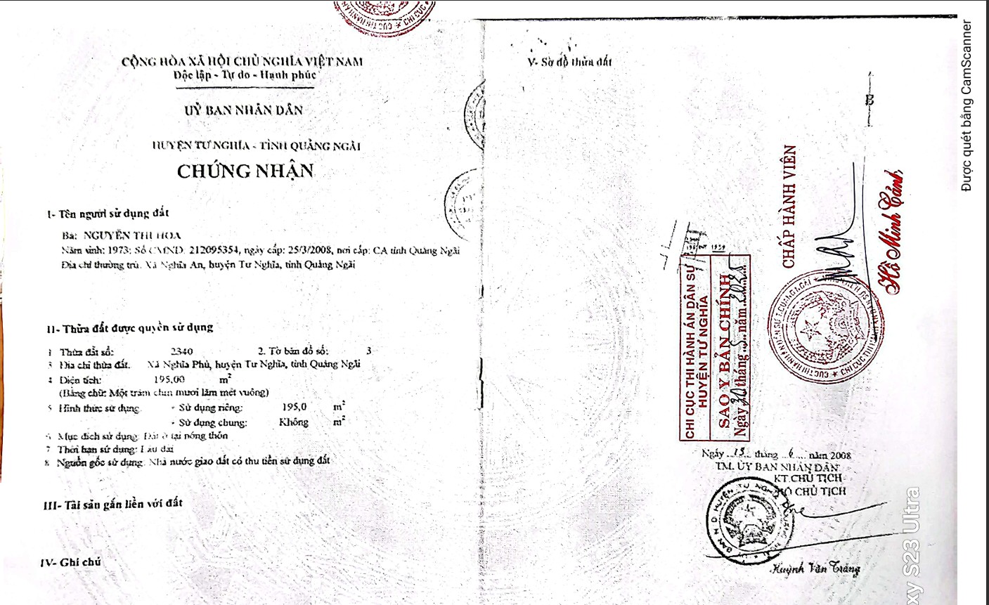 (Theo Giấy chứng nhận quyền sử dụng đất, quyền sở hữu nhà ở và tài sản khác gắn liền với đất số: AM 872884; Số vào sổ cấp GCN: H 00349 do UBND huyện Tư Nghĩa cấp ngày 19/6/2008 cho bà Nguyễn Thị Hoa và theo Biên bản về việc tự nguyện bàn giao tài sản để thi hành án ngày 11/4/2025 giữa Chi cục Thi hành án dân sự huyện Tư Nghĩa, người được thi hành án, người phải thi hành án và các bên liên quan)