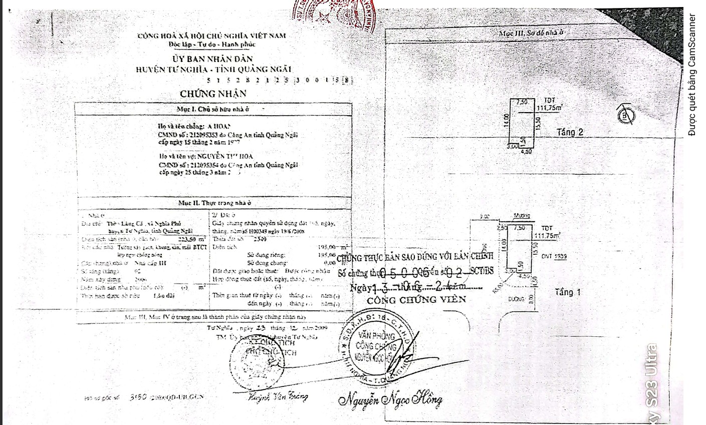 - Ngôi nhà được xây dựng vào năm 2006 và được Ủy ban nhân dân huyện Tư Nghĩa cấp giấy chứng nhận quyền sở hữu nhà ở số 3130/2009/QĐUB-GCN ngày 23/12/2009.