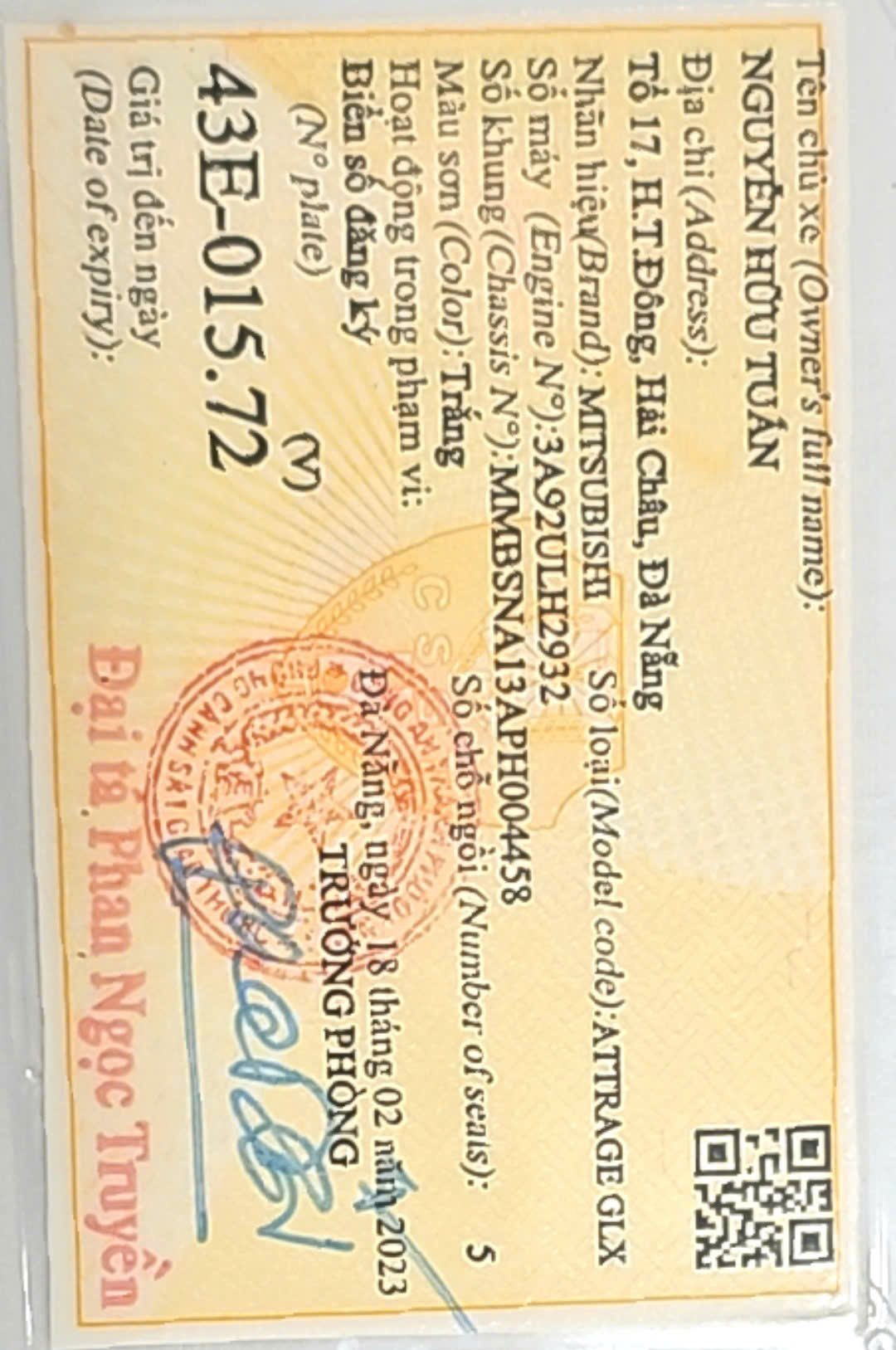 Bán theo nguyên trạng thực tế 01 xe ô tô con đã qua sử dụng biển số đăng ký: 43E-015.72; nhãn hiệu MITSUBISHI; số loại ATTRAGE GLX; số máy: 3A92ULH2932; số khung: MMBSNA13APH004458; 05 chỗ ngồi; màu trắng (Theo Giấy đăng ký xe ô tô số 43034853 do Phòng Cảnh sát giao thông – Công an thành phố Đà Nẵng cấp ngày 18/02/2023 đứng tên Nguyễn Hữu Tuấn).