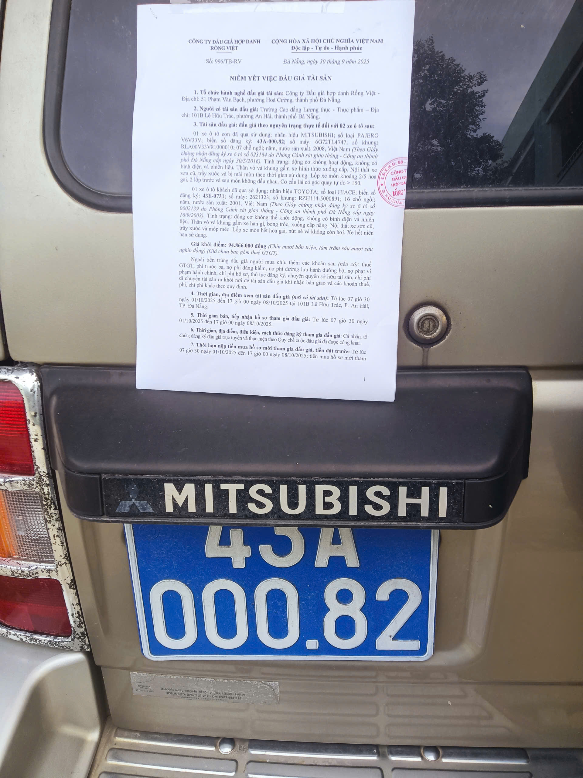 01 xe ô tô con đã qua sử dụng; nhãn hiệu MITSUBISHI; số loại PAJERO V6V33V; biển số đăng ký: 43A-000.82; số máy: 6G72TL4747; số khung: RLA00V33V81000010; 07 chỗ ngồi; năm, nước sản xuất: 2008, Việt Nam (Theo Giấy chứng nhận đăng ký xe ô tô số 023164 do Phòng Cảnh sát giao thông - Công an thành phố Đà Nẵng cấp ngày 30/5/2016). Tình trạng: động cơ không hoạt động, không có bình điện và nhiên liệu. Thân vỏ và khung gầm xe hình thức xuống cấp. Nội thất xe sơn cũ, trầy xước và bị mài mòn theo thời gian sử dụng. Lốp xe mòn khoảng 2/5 hoa gai, 2 lốp trước và sau mòn không đều nhau. Cơ cấu lái có góc quay tự do > 150.