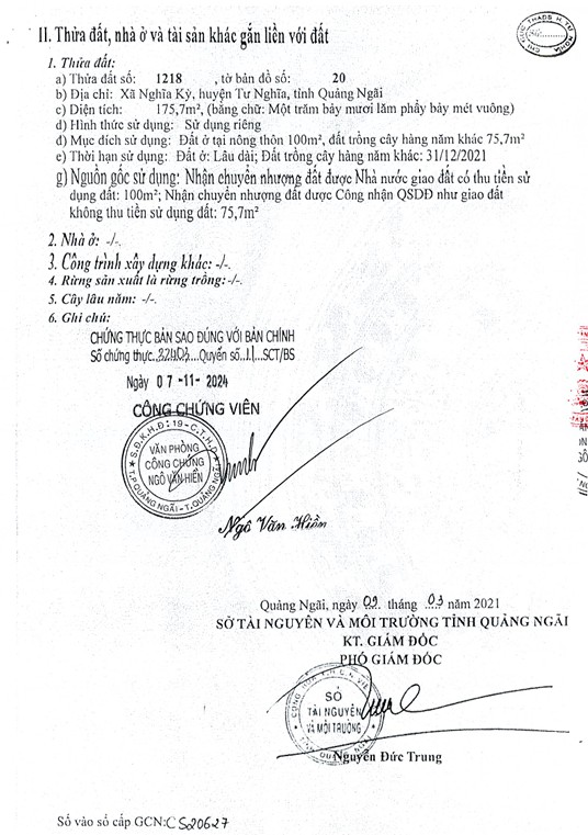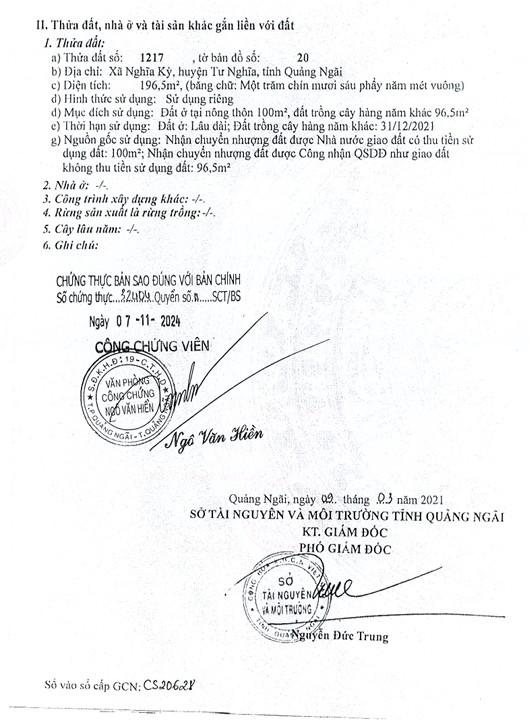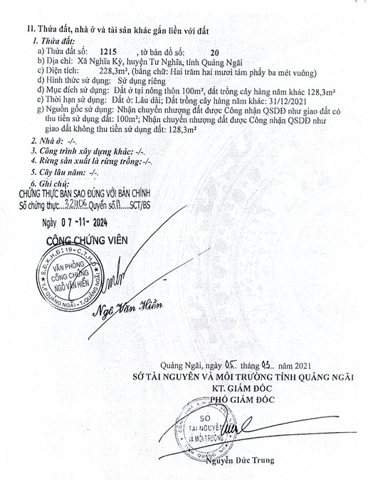 Địa điểm xem tài sản: tại các thửa đất số 1215, 1216, 1217, 1218 chung tờ bản đồ số 20; địa chỉ: xã Nghĩa Kỳ, huyện Tư Nghĩa, tỉnh Quảng Ngãi (Nay là xã Nghĩa Giang, tỉnh Quảng Ngãi).